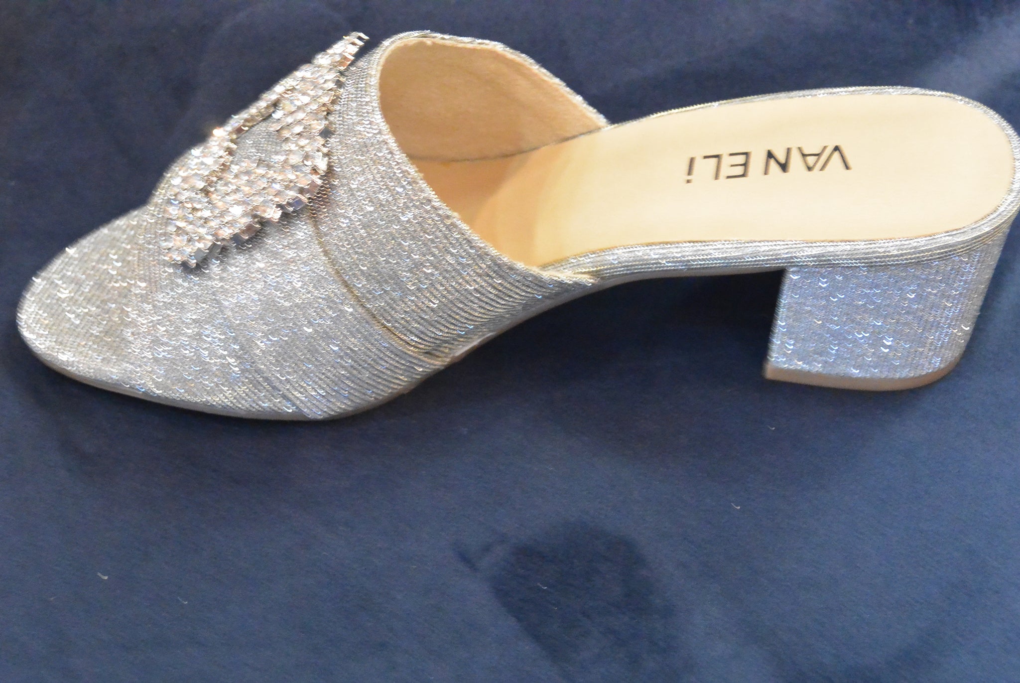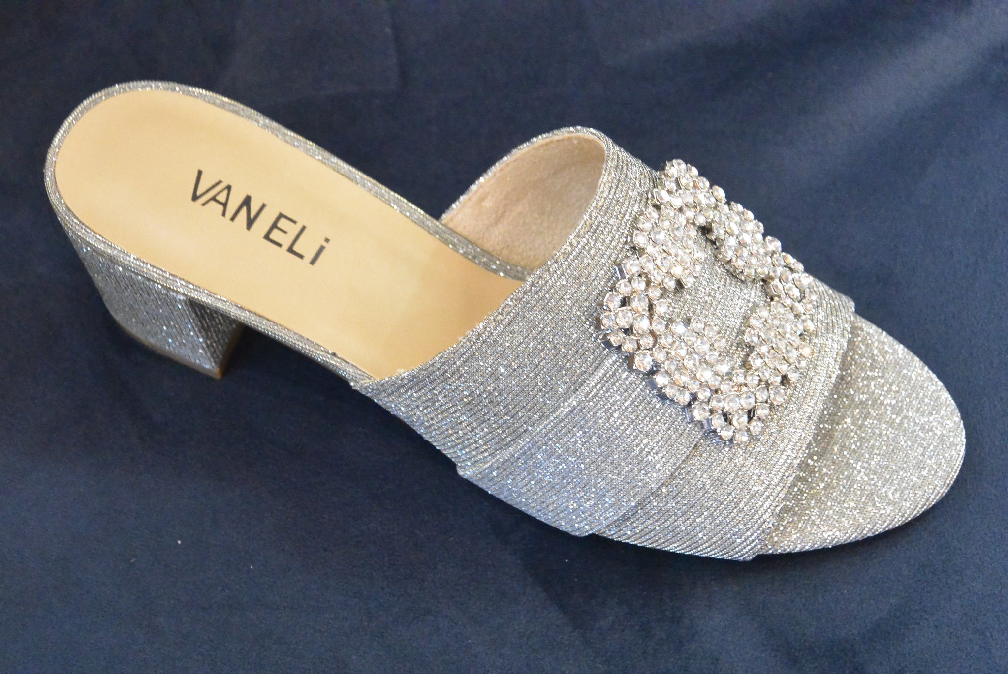 Classicly cute and all-day-wearable. We love this sandal. Step into elegance with the Odayle Slide Sandal by VANELi, a chic addition to any sophisticated wardrobe. With its block heel design, offering a low heel height of 1 1/4"-2", and medium shoe width, it provides both comfort and style for women. Ideal for various occasions, these open-toe sandals are a perfect blend of fashion and function. Silver bedazzled adds elegance to this beautiful dressy shoe!
